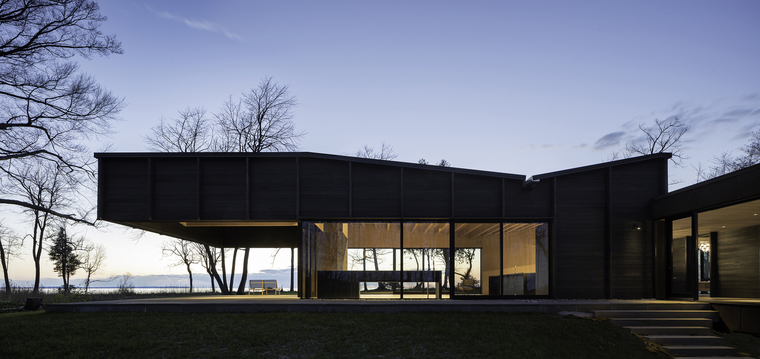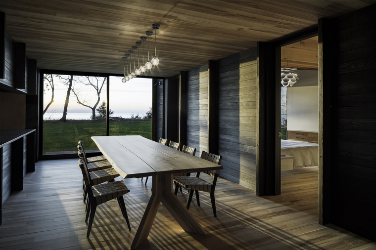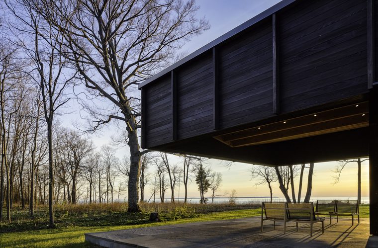 暴露在外的木梁擺放位置使得整個室內(nèi)空間里的拱頂看起來并不對稱。在小木屋的南端,6米長的懸梁屋頂延伸至觀景休息平臺,屋頂為其提供了一種保護,同時對密歇根湖和周圍的美景一覽無余。