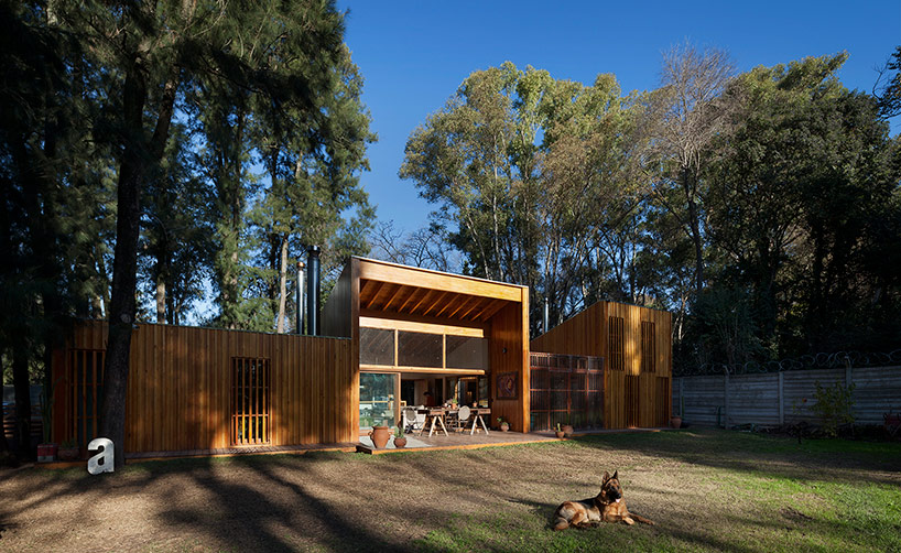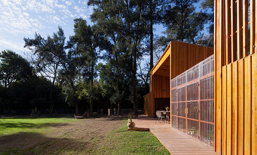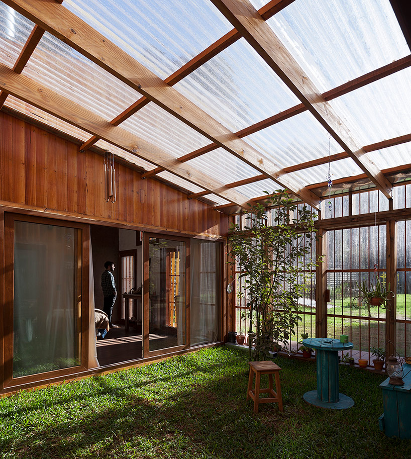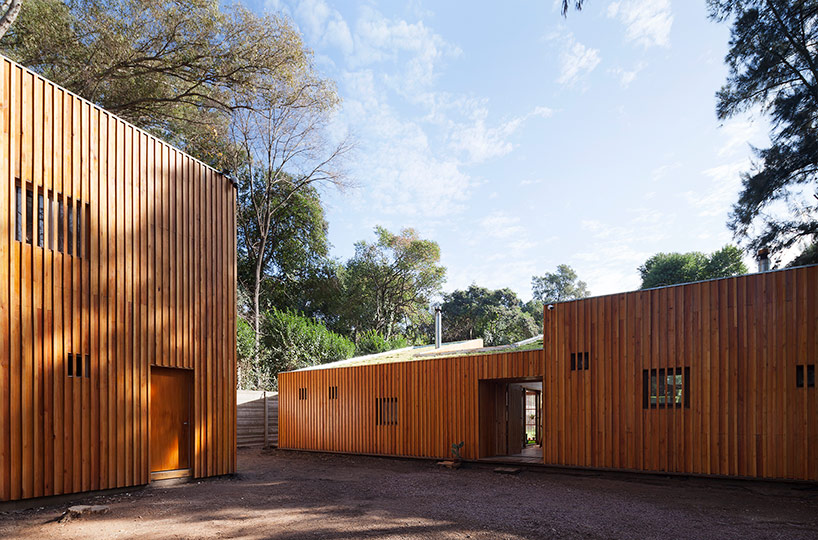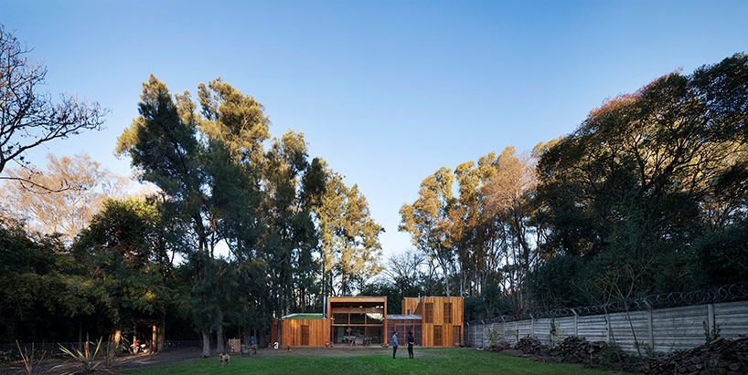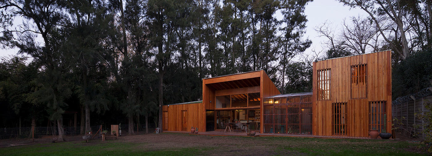 阿根廷建筑事務(wù)所IR arquitectura與我們分享的項目,是位于阿根廷布宜諾斯艾利斯(Buenos Aires)郊外托爾圖吉塔斯市(Tortuguitas)的 Casa Aa節(jié)能住宅。在這個養(yǎng)育著孩子的家庭住宅,家里明確地劃分出大人與小孩間的分隔,同時又融入樹木茂盛的場地環(huán)境中,擁有進(jìn)行室外活動的空間和充沛的陽光。波浪狀聚碳酸酯屋頂覆蓋下的半室外綠色庭院是個溫室和有頂花園空間,并與位于中心位置的矩形起居空間相鄰。共享的起居區(qū)和主臥擁有朝北最高的洞口,使能照射到的陽光最大化,而建筑的外部形態(tài)因此被分割成四部分。上下交替的傾斜綠色屋頂提供了一個很好的天然熱絕緣體,還有助于替換建筑所占據(jù)的自然地被。