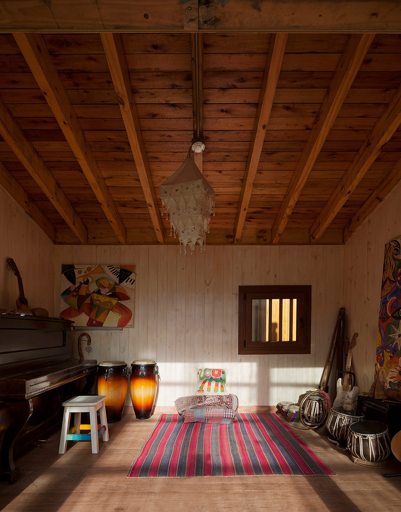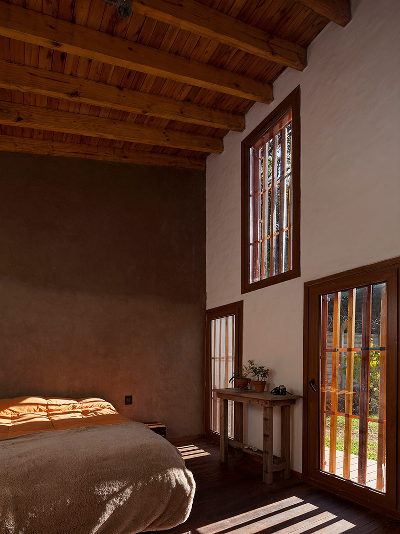 該建筑的木框架結(jié)構(gòu),基本是由從本地采購的木材構(gòu)成,而承重墻在下方支撐著厚層壓木梁。外部隔板的壁柱間的凹陷空間,被填充成濕茅草泥土墻,與綠色屋頂共同作用為低能耗、高熱效的建筑表皮。除了起居室擁有開闊視野和充沛光線的大面積玻璃窗之外,垂直排列的木板構(gòu)成的其余外立面共同形成了微妙的韻律感。百葉木條不斷延伸排列橫跨窗戶,既保證了私密性,也是自然光的過濾器。