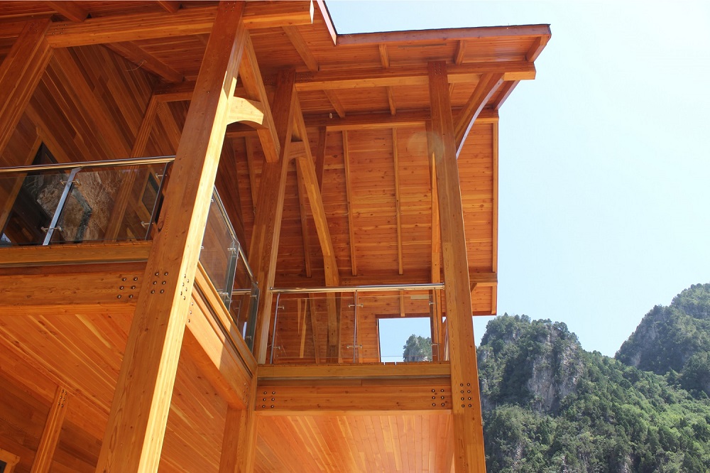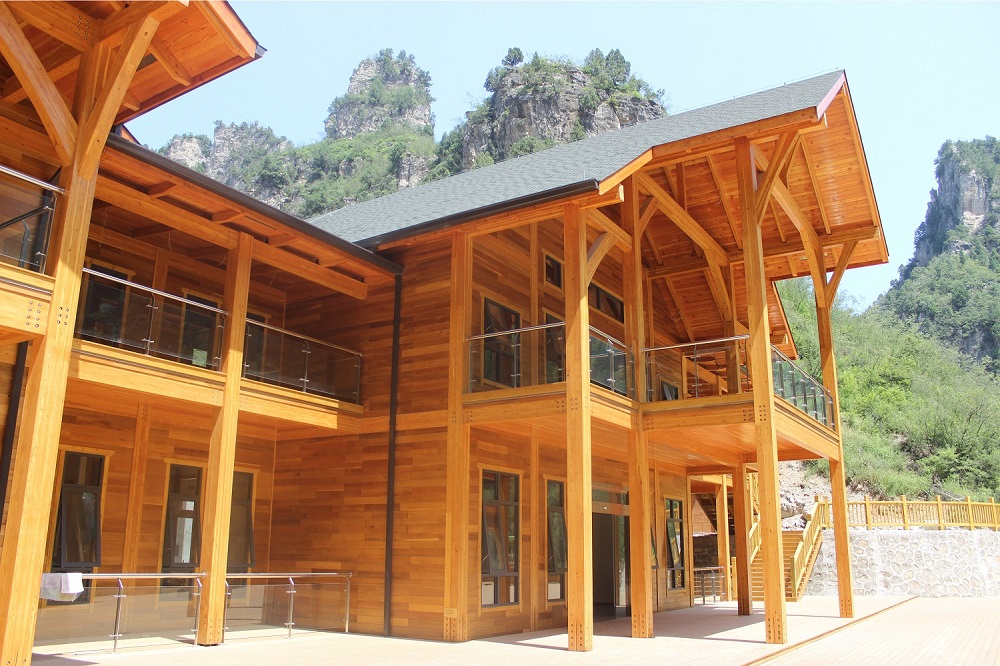 河南焦作龍翔山旅游度假區(qū)接待中心項目是目前河南省最大的單體花旗松膠合木項目,最大跨度達到10m以上,為河南木結構行業(yè)的發(fā)展起到了帶動作用。