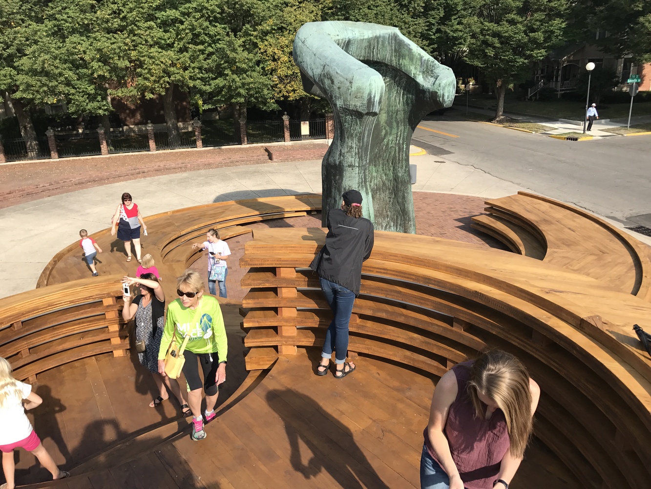 IKD給Cleo Rogers紀(jì)念圖書(shū)館廣場(chǎng)的設(shè)計(jì)方案,題目是對(duì)話基座 (Conversation Plinth),其目的是為了向 J Irwin Miller 致敬并慶祝哥倫布社區(qū)。它的形式是受 Miller House 談話的正廳的啟發(fā), 同時(shí)他的“基座”抬高并強(qiáng)調(diào)了場(chǎng)地周?chē)闹匾貥?biāo)建筑-貝聿銘設(shè)計(jì)的圖書(shū)館,由薩里寧設(shè)計(jì)的第一個(gè)基督教堂,和亨利.摩爾設(shè)計(jì)的 Large Arch。