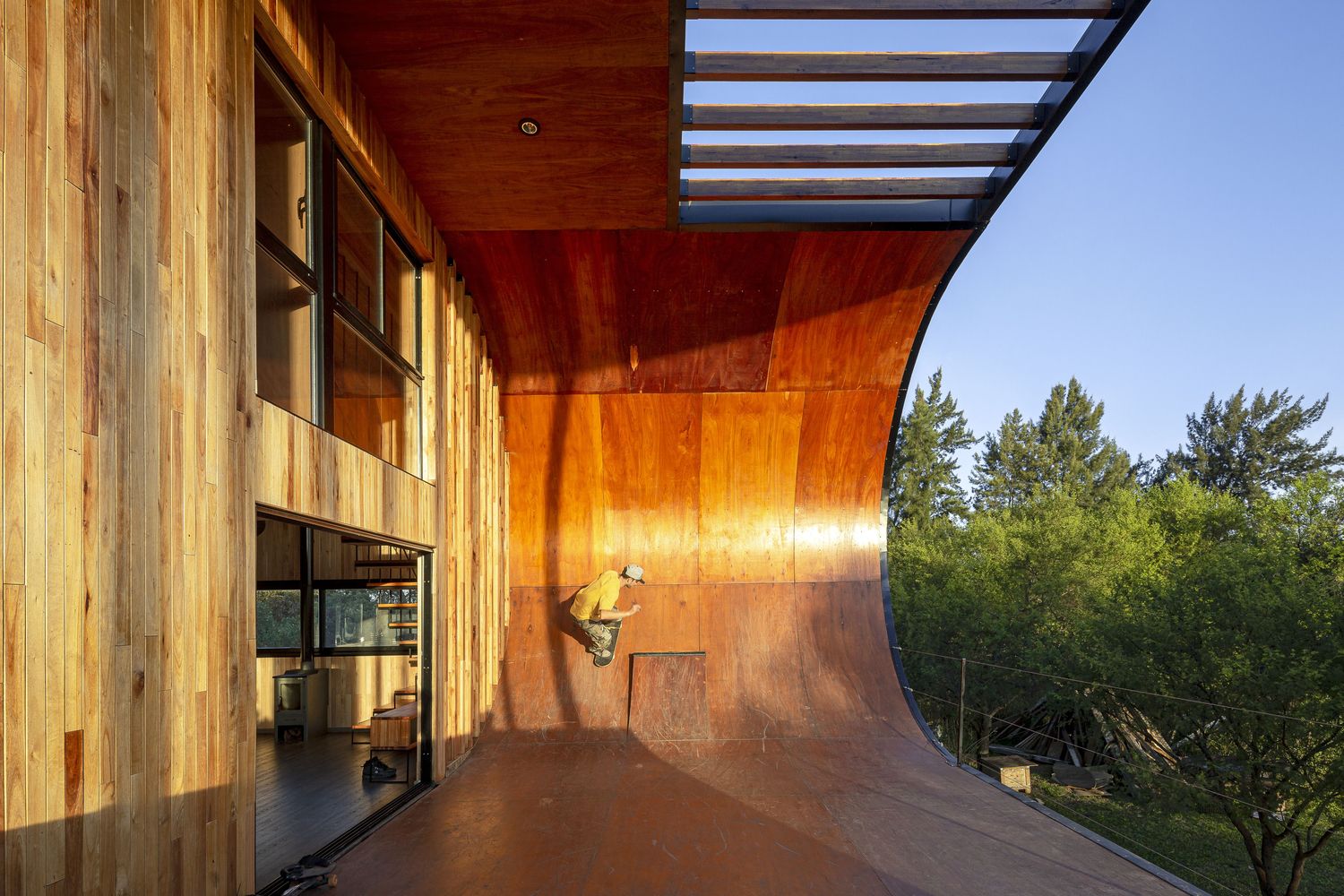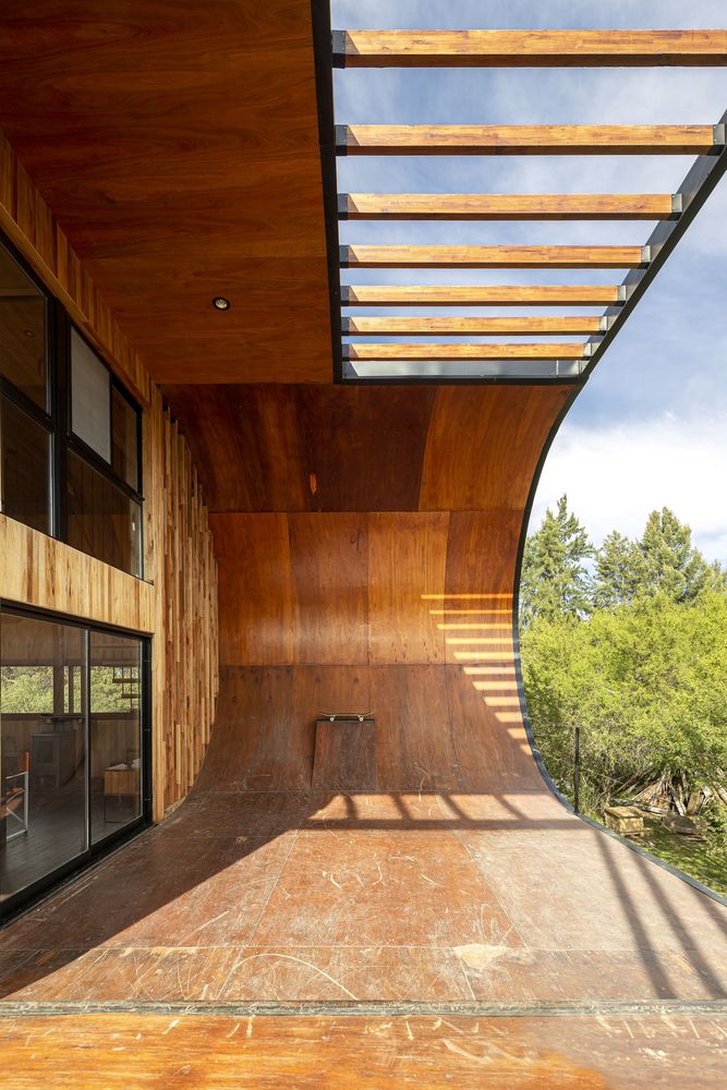這是一個100%可持續(xù)的住宅,同時業(yè)主也可以在上面滑滑板。業(yè)主是一名滑板者,希望房子本身附帶一個滑板場地。設(shè)計師將室外陽臺設(shè)計成滑道,并在向南一側(cè)設(shè)置一面墻,在住宅東南角形成一個向上的弧形用于減速。這面墻延伸到了屋檐處,起到阻擋夏天烈日的作用。