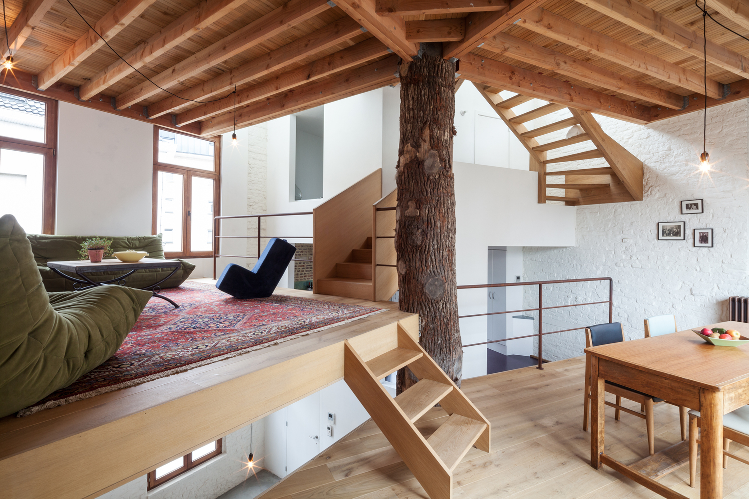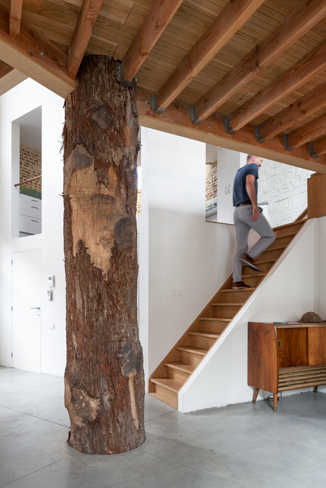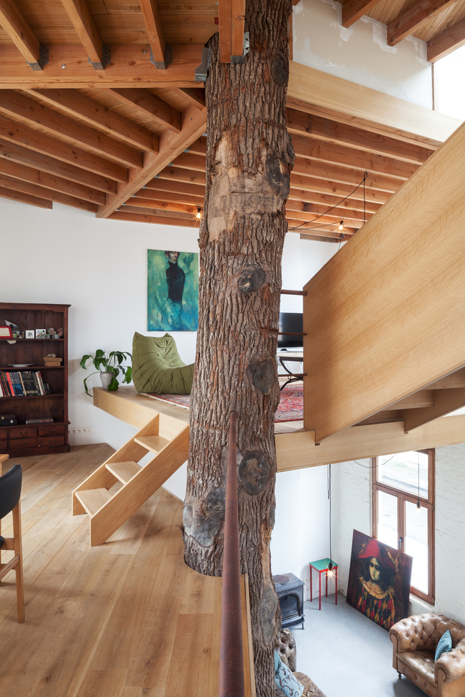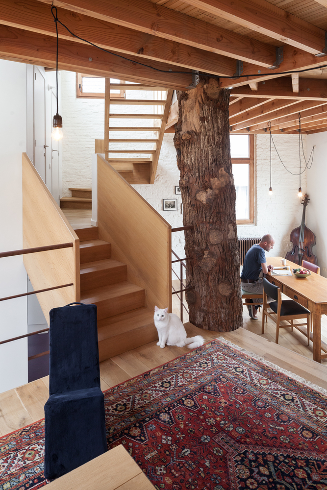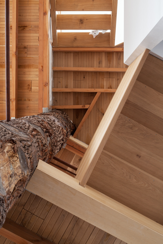 一段橡樹樹干被放置在五邊形平面正中間,作為新的支撐結(jié)構(gòu)。新的上層樓層懸掛在原有外墻和中心支柱之間,呈螺旋式上升。這樣就在生活區(qū)域內(nèi)創(chuàng)造出沒有任何內(nèi)墻的開放室內(nèi)空間。樹干中柱是一個(gè)合乎邏輯且經(jīng)濟(jì)實(shí)惠的解決方案,它立即為新居所帶來了合適的氛圍。衛(wèi)生間、廚房、入口和儲藏室/洗衣房都設(shè)置在縱貫上下的封閉體塊中。