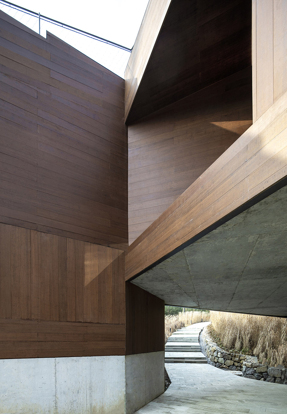 建筑的另外兩側(cè)分別嵌入山體之中,架空的蝶狀建筑的下方仍然保留了溪水和山路的通道。為了將部分樹(shù)木保留在室內(nèi),豎向結(jié)構(gòu)被設(shè)計(jì)成“柱院”,結(jié)構(gòu)意義上是柱子,空間意義上,是保留了一棵樹(shù)的“微院”。屋面是一個(gè)臺(tái)階狀的坡屋頂,可作為小型演出的森林劇場(chǎng),室內(nèi)空間被這個(gè)大坡屋頂統(tǒng)一起來(lái),并因?yàn)椴煌孛鏄?biāo)高的變化而富有節(jié)奏。