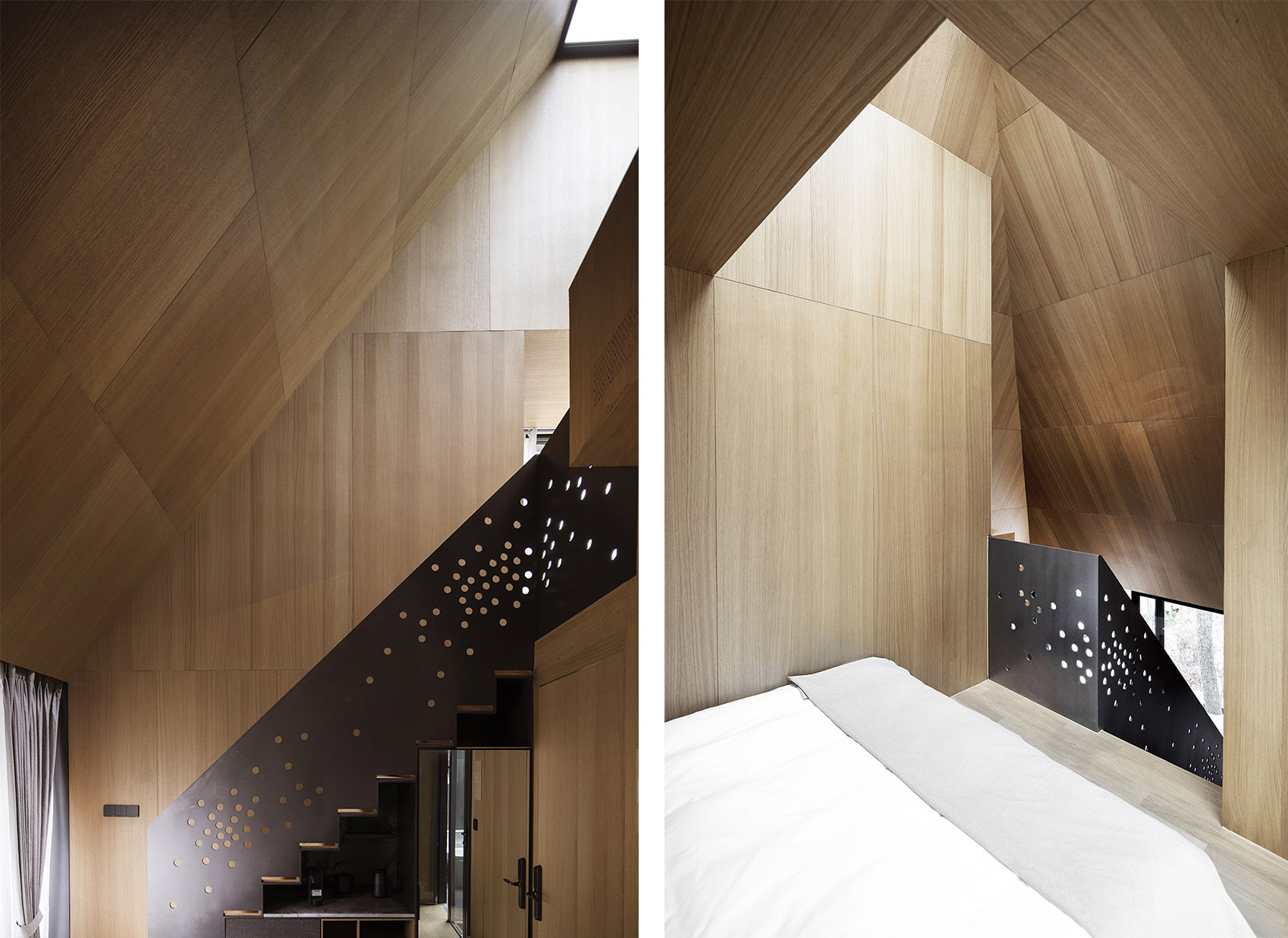 每個(gè)小屋中都保留了一棵場(chǎng)地原生的樹(shù)木,樹(shù)木所占據(jù)的空間成了屋中院,透過(guò)玻璃時(shí)刻于室內(nèi)生活相伴,是自然向建筑的反向滲透,屋中院也為室內(nèi)衛(wèi)生間提供了具有私密性的風(fēng)景。