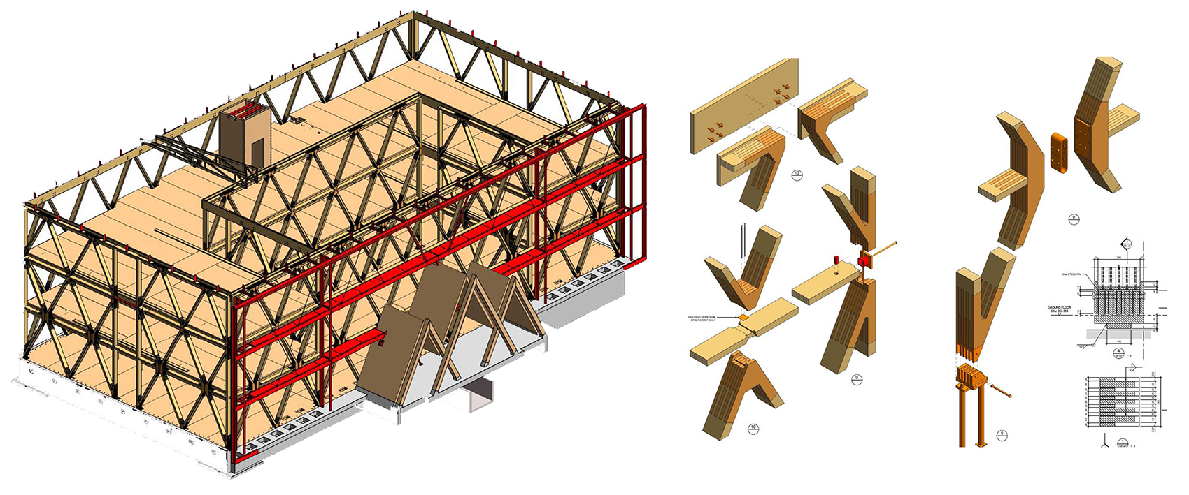 木制的斜梁作為本項(xiàng)目中最為鮮明的建筑語言,向人們展現(xiàn)出木結(jié)構(gòu)建筑與鋼筋混凝土建筑的不同,這些斜梁就如同真實(shí)的樹枝,建筑的荷載隨著木材的紋理被逐漸消解,保證了整體結(jié)構(gòu)的強(qiáng)度。在本項(xiàng)目中,設(shè)計(jì)采用了一種創(chuàng)新式的木結(jié)構(gòu)節(jié)點(diǎn)轉(zhuǎn)移荷載,結(jié)構(gòu)中還置入了可替換的抗震裝置。